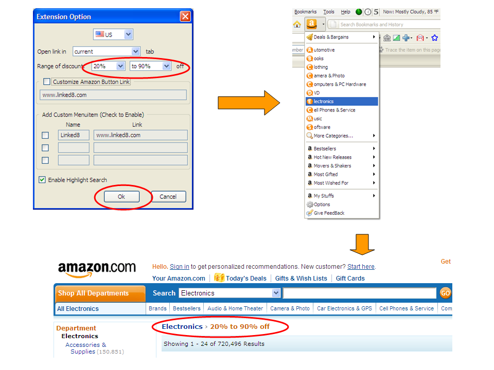 • Choose your own range of discount percentage for any product categories on Amazon US and UK sites. For example, you can choose 20% or more as your preferred discount range, thereafter all your clicks on discount links will lead you to see products 20% off or more on Amazon. You may change this setting any time and get desired discount percentage range immediately.